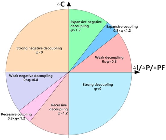 The variables φI, φP, and φPF represent the decoupling elasticity of carbon emissions from residential buildings in relation to per capita residential disposable income, population, and per capita residential floor space, correspondingly. The indicators ΔC, ΔI, ΔP, and ΔPF denote the changes in Residential Building Carbon emissions alongside per capita residential disposable income, population, and per capita residential floor space over the period T. Figure 3 offers a general categorization of decoupling states based on the Tapio decoupling model, while Table 1 presents a detailed summary of the explanatory and dependent variables.