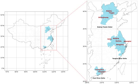 This study encompasses 48 cities across three major urban clusters in China: the Yangtze River Delta, the Pearl River Delta, and the Beijing–Tianjin–Hebei region. It employs the China Building Energy Consumption Measurement Method (CBECM), established in prior research, to assess the energy consumption of both urban and rural residential buildings from 2005 to 2020. Data on building area and energy consumption are sourced from the Urban and Rural Construction Energy Consumption and Carbon Emission Database (CBEED), which has been extensively utilized in previous studies. Additional economic and population data are obtained from the China Statistical Yearbook. The locations of the carbon emissions situation in urban agglomerations and their case cities are shown in Figure 4.