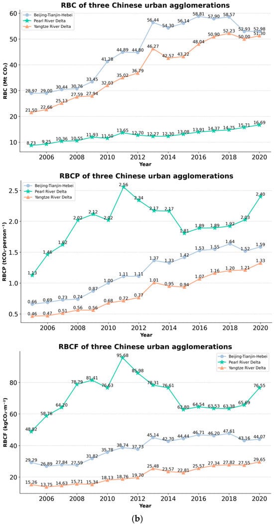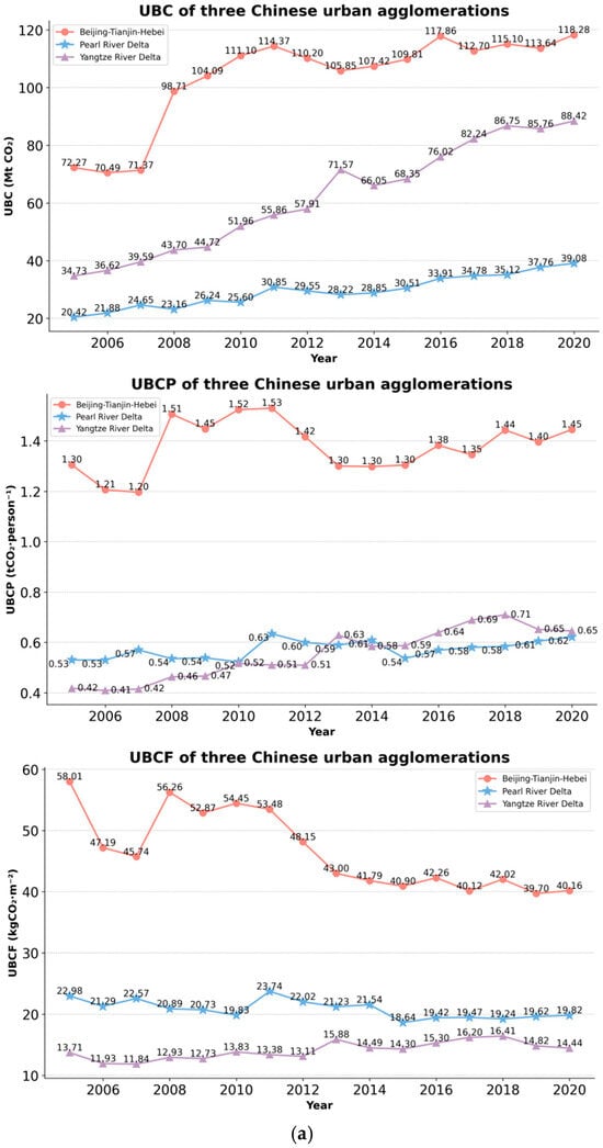 The evolution of carbon emissions from residential buildings in urban areas between 2005 and 2020 is depicted in Figure 5a. Despite some fluctuations, the agglomeration, with an increase of 1.91 times, and then the Beijing–Tianjin–Hebei (BTH) urban agglomeration, has risen by 1.64 times. These trends in UBC reflect China’s economic growth, rapid urbanization, and improving living standards. The overall trend in urban building carbon (UBC) emissions for the three urban agglomerations shows a consistent upward trajectory. Notably, the Yangtze River Delta (YRD) urban agglomeration has experienced significant growth, increasing by 2.55 times over the past 16 years. This is followed by the Pearl River Delta (PRD) urban important to highlight that the UBC in the Beijing–Tianjin–Hebei urban agglomeration is substantially higher than that of the other two regions, climbing from 72.27 Mt. CO2 in 2005 to 118.28 Mt. CO2 in 2020. This increase is closely linked to the region’s geographical conditions, as the northern location necessitates winter heating.