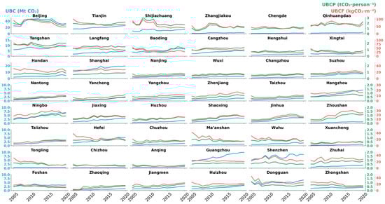 Utilizing the assessment method outlined in Section 2.2, Figure 8 provides a detailed overview of carbon emissions from buildings across the three major urban agglomerations. Upon comparing and analyzing the peak characteristics of carbon emissions in these regions, it became evident that, except for seven specific cities, the Urban Building Carbon (UBC) levels in all other urban agglomerations exhibited a rapid growth trend. Notably, both the Urban Building Carbon Peak (UBCP) and the Urban Peak Carbon Footprint (UPCF) of many cities reached their historical highs before 2015.