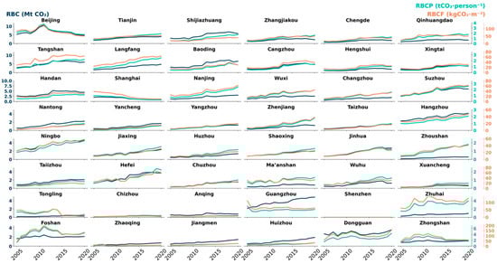 Similarly, the UBCF data indicate that 20 cities peaked before 2015, including 14 cities such as Tianjin, Tangshan, and Baoding, which also reached their highest UBCP values in 2005. When comparing levels from 2005, Zhaoqing, Zhoushan, and Yancheng exhibited the most significant increases in UBCP and UBCF. By 2020, UBCP had risen by 689%, 291%, and 226%, respectively, while UBCF had increased by 315%, 178%, and 107%, respectively. In contrast, Ma’anshan experienced a notable decline, with its UBCP and UBCF decreasing by 29% and 65%, respectively, in 2020. The growth in Zhaoqing, Zhoushan, and Yancheng can be credited to population growth and economic development. Conversely, Ma’anshan’s sharp decline resulted from the growth rate of carbon emissions lagging behind the increases in urban population and building area. The evolution trends of RBC, RBCP, and RBCF between 2005 and 2020 are illustrated in Figure 7.