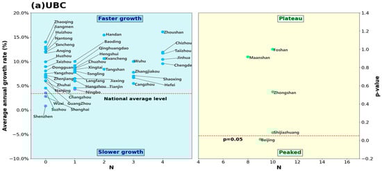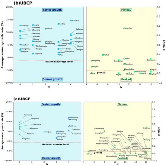 There are notable distinctions between UBCP and UBC peak evaluations. Specifically, the number of cities in the rapid growth phase of UBCP has declined from 41 to 32, with no cities identified as experiencing slow growth. It is essential to highlight that eight cities—Tangshan, Zhuhai, Langfang, Ningbo, Zhongshan, Wuhu, Ma’anshan, Zhangjiakou, and Dongguan—reached the peak of UBCP before 2015, subsequently entering a plateau stage. As UBCP peaked, seven cities—Jinhua, Beijing, Shenzhen, Shijiazhuang, Foshan, Xingtai, and Tongling—exhibited a clear downward trend, indicating their transition into the peak stage.