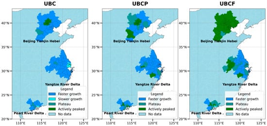 Figure 9 illustrates the distribution of peak assessment results for UBC, UBCP, and UBCF across various geographical locations. This map highlights the effectiveness of China’s efforts in controlling and reducing carbon emissions in different regions. Most UBC cities within the three major urban agglomerations are currently in a rapid growth phase. The Beijing–Tianjin–Hebei (BTH) urban agglomeration has already reached the UBCF peak, with its UBCP primarily in a plateau or peak stage. The decoupling of UBC, UBCP, and UBCF among peaking cities in these urban agglomerations has also reached their maximum levels. The three indicators reach their peaks in the following sequence: carbon emissions per floor space peak first, followed by carbon emissions per capita, and finally the total carbon emissions. This conclusion may further support the findings of Li et al. [] and Huo et al. [].