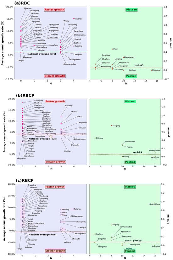 The results of the RBCF peak assessment are illustrated in Figure 10c. The study reveals that 28 cities are experiencing rapid growth, while another eight cities, including Anqing, Tianjin, Handan, and Langfang, have entered a phase of relatively slow growth. Before 2015, the RBCF for 12 cities had reached its maximum value, indicating that they were at a plateau or peak stage. Additional MK trend test findings suggest that eight cities, such as Guangzhou, Chizhou, Tongling, Qinhuangdao, and Tangshan, have transitioned into the plateau period. Notably, Foshan, Zhongshan, Beijing, and Shanghai have entered the peak period of RBCF.