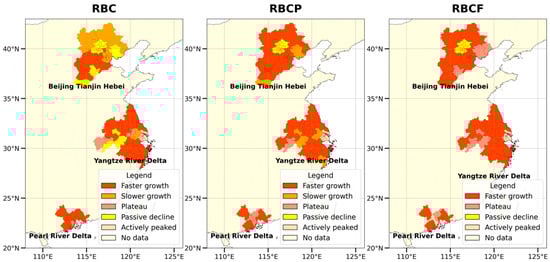 This observation aligns with prior research findings indicating that carbon emission peaks can manifest in regions with varying levels of economic development and energy structures []. The study further highlights that due to differences in social and economic progress, the peak carbon emission scenarios in various urban agglomerations and cities exhibit significant diversity. Urban agglomerations possess unique economic, social, climate, and environmental advantages. Collaborative efforts in carbon reduction can foster a joint approach to meeting emission reduction targets, ultimately leading to a comprehensive peak. This insight provides a valuable reference for other sectors and economies as they evaluate their peak carbon emission strategies. Figure 11 shows the spatial distribution of carbon peak in urban residential buildings (RBC; RBCP; RBCF).
