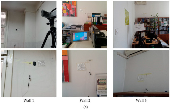 For Wall 1, the measurement was carried out in the period between 14 December 2018 and 17 December 2018—the duration of measurement was 72 hours, and 433 data points (heat fluxes, thermograms, and air temperatures) were captured. The wall is located in the Construction Materials Laboratory at the University of Zagreb, Faculty of Civil Engineering. The internal environment was heated using radiators from 6:00 until 22:00, and the internal surface was not directly exposed to sunlight. The air conditioning unit was turned off during the whole measurement period. The external environment is located in the laboratory’s atrium, which is not heated. The exterior surface is protected from environmental conditions (rain, wind, direct solar radiation) by the atrium’s roof. The camera was placed 2.70 meters from the measured wall (Figure 6a), and the heat flux sensor was placed on the same wall with thermocouples for measuring indoor (Figure 6a) and outdoor air temperatures. Camera parameters were set to reflected temperature 25.0 °C, RH 60%, and atmospheric temperature 22.5 °C.