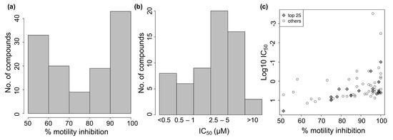 A library of 2121 drugs approved for clinical use (obtained from the UCSF Small Molecule Discovery Center) was screened in a phenotypic assay against adult female B. pahangi at 10 µM (Table S1) using the WormAssay software (University of California San Francisco, San Francisco, CA, USA) and dark-field plate imaging system []. A total of 124 drugs showed ≥50% inhibition of motility on day 3 (Figure 1A; Table S2) and a subset of 62 among these active drugs (based on motility inhibition and commercial availability) was screened in a dose response assay to determine their IC50 values (Figure 1B). The drugs showing higher levels of inhibition of motility tended to also have lower IC50 values (Figure 1C, correlation coefficient = −0.82 for the top hits).