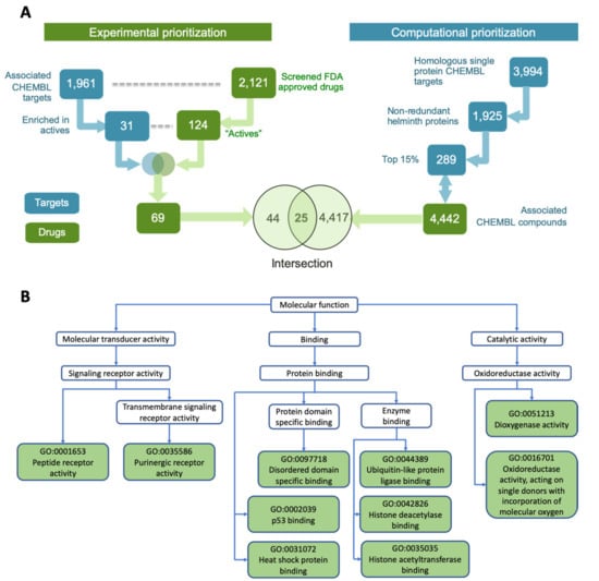 Further prioritization among these 69 compounds was done by considering a set of potential anthelmintic targets previously reported by us, as a part of International Helminth Genomes Consortium []. Briefly, an omics-driven pipeline to identify the most promising targets from parasitic worms was implemented using 528,469 proteins from 33 parasitic worms (including all major filarial species of human importance), yielding identification of 3994 ChEMBL homologous targets (Figure 2A). Further reduction in redundancy, via recognition of members of the same orthologous protein families, reduced the 3994 targets to 1925 ChEMBL targets. Identifying the commercially available compounds associated with these top targets having desirable properties (e.g., Quantitative Estimate of Druglikeness (QED) score, FDA approved) and selecting a structurally diverse set among these resulted in 4442 drugs and drug-like compounds (Figure 2A).