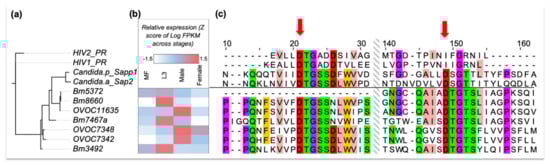 (a) A maximum-likelihood phylogenetic tree based on sequence similarity of aspartic proteases in B. malayi, O. volvulus, HIV and two Candida species. (b) Developmental stage-specific (mf, L3, and male or female adult worms) gene expression levels of the filarial APs in B. malayi and O. volvulus, as indicated by their protein IDs starting with Bm and OVOC, respectively. (c) Amino acid sequence alignments of aspartic proteases (shown only around the DTG/DTG and DTG/DSG motifs), with the two aspartic acid residues in the active site indicated by red arrows. HIV-PR only uses a single DTG active site as it forms a homodimer to constitute its protease activity. The alignment is color coded using the Zappo color scheme of Jalview, colors the residues according to their physicochemical properties—aliphatic or hydrophobic (pink), orange (aromatic), red (negative), green (hydrophilic), purple (conformationally special). Only the residues with moderate or high conservation are colored (i.e., conserved in at least 5 out of 11 aligned residues).