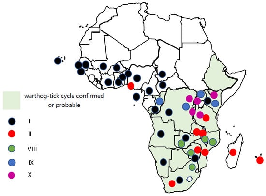 After its discovery in the Angónia district of Tete province, Mozambique in 1998 [], the genotype II virus spread widely in Mozambique, causing outbreaks in Nampula and Cabo Delgado provinces in 2001–2004 as well as around the city of Maputo from September 2004 []. It was several years later that it was demonstrated that the majority of viruses isolated from Ornithodoros ticks from warthog burrows in the Gorongosa National Park, Mozambique belonged to genotype II [], suggesting that genotype II viruses are maintained in the warthog-tick sylvatic cycle as well as in domestic pigs.