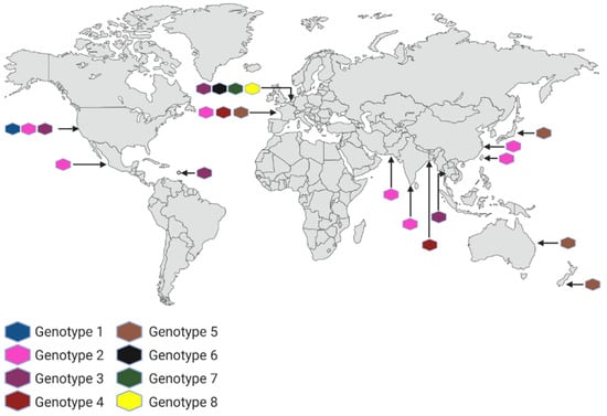 Geographical distribution of genotypes (clinical and environmental cases) of N. fowleri worldwide. Created with BioRender.com (accessed on 26 August 2022).