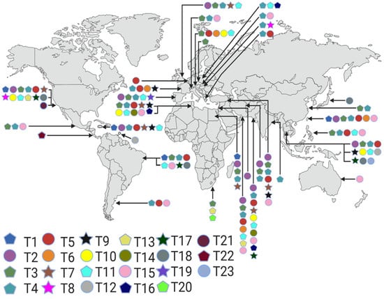 Geographical distribution of genotypes (T1-T23) and morphology (clinical and environmental cases) of Acanthamoeba spp. Star, pentagon, and circle correspond to groups 1, 2, and 3 according to the morphological relationship of the cysts. Created with BioRender.com (accessed on 11 July 2022).