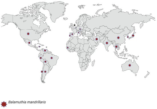 Geographic distribution of isolates (clinical and environmental cases) of B. mandrillaris globally. Created with BioRender.com (accessed on 3 October 2022). * Study presenting the clinical case in the Netherlands is inconclusive as to whether the infection was acquired in Gambia or the Netherlands.