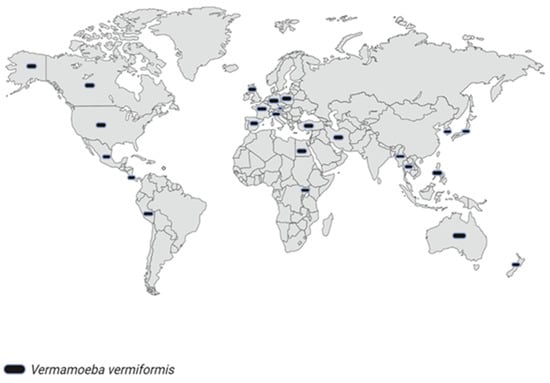 Geographical distribution of V. vermiformis in the world, mostly from isolates in cases of keratitis caused by other organisms. Created with BioRender.com (accessed on 26 August 2022).