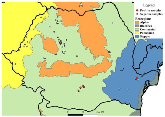 Sampling areas and distribution of T. callipaeda in European brown hares from Romania, by ecoregion.