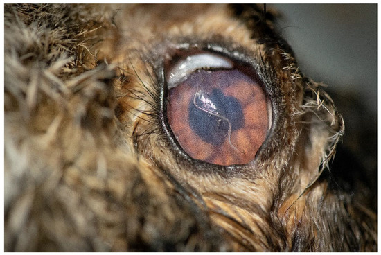 As part of the necropsy procedure, the eyes of each carcass were examined under a stereo zoom microscope, with the lateral and medial canthus dissected to uncover the entire globe. Upon detection, nematodes were placed in a vial with physiological saline (0.9%), followed by a morphological examination.