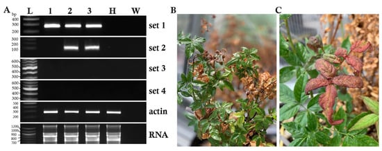 Total RNA was extracted from a frozen leaf homogenate obtained from a highly infected RRV plant (cv. Julia Child) [,]. We also extracted total RNA from two branches of a highly diseased, RRV- infected rose shrub (cv. Ducher) that we maintain in the greenhouse (Figure 1B,C). RT-PCR was performed, and the set 1 primers confirmed the presence of RRV in all samples. Set 2 primers only detected RRV in the samples from the greenhouse-grown rose shrub. Sets 3 and 4 produced negative results (Figure 1A). Based on these results, we performed subsequent experiments using primer set 1 and the sap from the infected rose plants as a positive control for RT-PCR analyses.