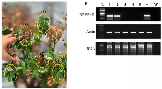 3.1. RT-PCR Detection of RRV in Systemically Infected Plants