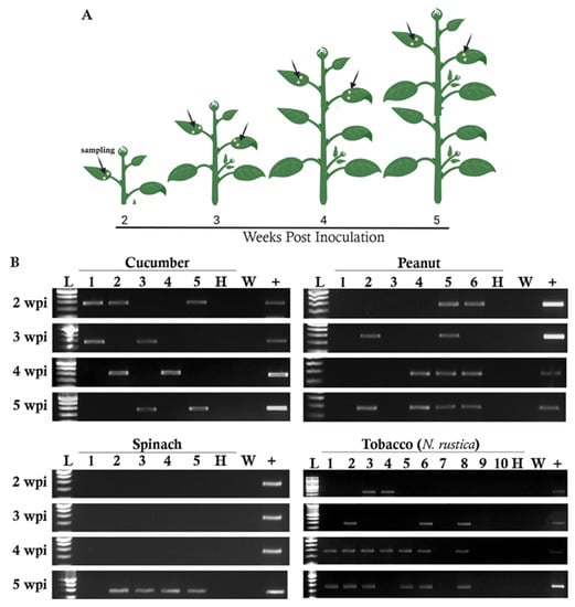 RT-PCR products amplified from the weekly sampling of plants inoculated with RRV-containing crude sap. These representative examples are also in Table 3. (A) Diagram showing samples taken between 2 and 5 wpi from newly emerging leaves for RT-PCR testing for RRV infection. (B) 271 bp RT-PCR amplicons were analyzed using ethidium bromide-stained 2% agarose gel. The plant’s common names atop each set of gels. The time of sample harvest is indicated on the left. Lane L, 100 bp ladder; lanes 1 through 5, 1 through 6, or 1 through 10 identify individual plants. H represents the mock-inoculated control, W is the water control for the RT-PCR reaction, and “+” identifies the RT-PCR products derived from the sap inoculum.