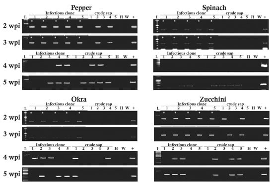 When RRV-containing crude sap was the inoculum, there were two pepper and two zucchini plants systemically infected at 2 wpi. At 3 wpi two zucchini plants also tested positive by RT-PCR but one of these plants was different from the prior week’s testing results. At 4 and 5 wpi, there were four pepper and three zucchini plants that tested positive by RT-PCR for RRV infection. For spinach, systemic infection was first detected at 5 wpi when crude sap was used as the inoculum. For okra, two plants showed systemic infection at 4 wpi (Table 4 and Figure 3). Spinach plants remained healthy for the first four weeks and become infected at 5 wpi. To further assess whether RRV spreads slowly to the upper leaves, we inoculated a subset of plants with either the infectious clone or RRV-containing plant sap. RT-PCR was performed weekly to monitor the spread of infection, and at 2 wpi the inoculated leaves of all plant species tested positive for RRV infection. Systemic infection was most evident at 4 or 5 wpi across hosts.