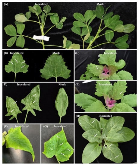 RRV symptoms on various host plants. These plants were mechanically inoculated with contagious crude sap from RRV-infected plants and maintained in the greenhouse. Symptoms developed on inoculated peanut (A), C. quinoa (B), C. amaranticolor (C,E), spinach (D), cucumber (F,G), and N. rustica (H) plants are shown. Panels (A,B,D) show the healthy on the right and infected plants on the left.