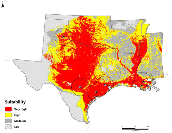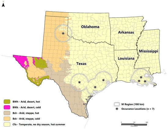 The average patient age was 42 (standard deviation = 6.7); six were male, and one was female. Four of the cases were located in Texas and three in Louisiana. Additional clinical and epidemiologic investigation descriptions are reported elsewhere [,]. Spatial information for each location was manually georeferenced with Google Earth (https://earth.google.com/) (accessed on 15 December 2021). Geographic coordinates for these locations were standardized in a geographic coordinate system (WGS84) in ArcGIS Desktop 10.8.1. (ESRI. ArcGIS desktop: release 10.8.1. Environmental Systems Research Institute, Redlands, CA, USA).