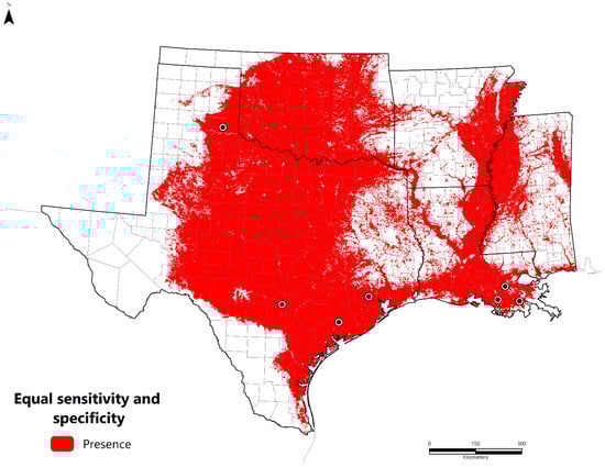 We obtained B. cereus strains isolated from seven metalworkers between 1994 and 2020. These cases were located in Louisiana (n = 3) and Texas (n = 4). The majority were clustered along the 30th parallel north in the humid subtropical climate zone (Cfa), except the southeastern Texas panhandle case, which features a cold, semi-arid climate (Bsk). The potentially suitable areas for B. cereus are presented in Figure 1 as a continuous surface and binary format based on the equal training sensitivity and specificity (sensitivity = specificity) threshold value of 0.451 (Figure 2). Suitable areas are located along the Gulf Coast throughout Texas, Louisiana, and Mississippi. Inland regions include the Texas Backland Prairies, East Central Texas Plains, Edwards Plateau, Cross Timbers, Mississippi Alluvial Plain, and Central Great Plains. Areas of low suitability include the eastern temperate forests of the South-Central Plains, Ozark Highlands, Boston Mountains, Trans-Pecos Region, and Southeastern Plains.