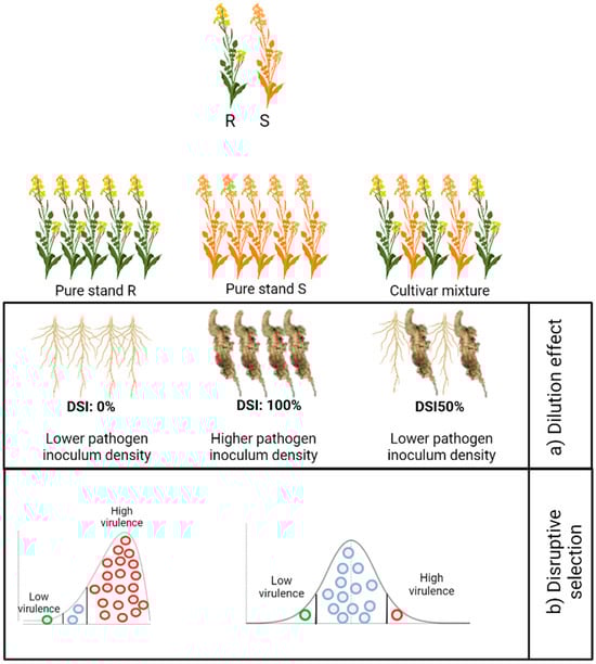 Illustration of the mechanisms of control for soilborne diseases using cultivar mixtures: (a) dilution effect and (b) disruptive selection. (a) The dilution effect occurs when a lower density of susceptible plants reduces the probability of infection compared to pure stands. (b) Disruptive selection maintains a diverse array of pathotypes due to a varied population of hosts, balancing low-virulence pathotypes with highly virulent ones, rather than selecting exclusively for resistance-breaking pathotypes. DSI, disease severity index. (Created with Biorender.com []).