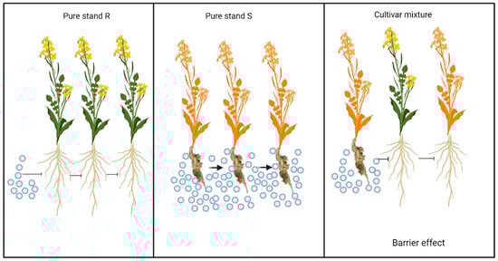Dilution effects occur when there is a lower density of susceptible plants in the field, leading to a reduced probability of infection (Figure 1). In the context of mixtures, only a fraction of the inoculum spreads among the various components, resulting in decreased disease severity and lower inoculum levels [,]. Understanding the dispersal mechanisms of a pathogen is crucial for estimating the effectiveness of dilution effects in limiting disease spread. Dilution effects from utilizing cultivar mixtures are maximized when inoculum is spread equally among different host genotypes. For example, pathogens disseminated in the soil, such as P. brassicae, will undergo fewer dispersal events per growing season compared to wind- or splash-dispersed pathogens like Zymoseptoria tritici (Septoria leaf blotch of wheat) or Leptosphaeria maculans (blackleg of canola) [].
