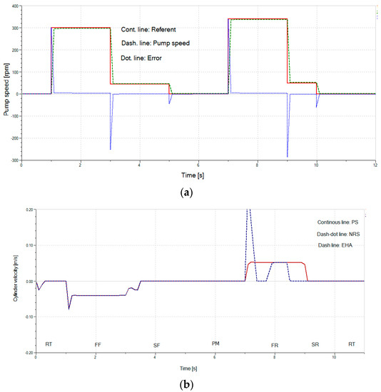 The open response of the cylinder according to the step input for three control strategies are presented in Figure 12b, in which the speed of the pump is 400 rpm, and the time period for each phase is described in Table 7. It is observed that, the velocity of the cylinder in the PS or the NRS strategy is much higher than that value for the EHA strategy within the FF phase. There are notches when the changing phases, and its value is about 15% according with the PS strategy. There is vibration in the PM stage within the EHA strategy, that is an effect of the external force.