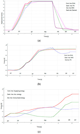 The energy flow of the system for PS strategy in the cycle is shown in Figure 14c. It can be observed that energy is always supplied from the motor, in which that energy is used to charge the accumulator in RT phase while that energy is used to overcome external load and push the cylinder out during FF and SF phases. On the other hand, the motor still supplies energy during the recovery phases and the recovery energy is stored in the accumulator instead of electronics drive as a traditional energy recovery EHA system. Moreover, it has also to be mentioned that the energy losses in the electronic drive are neglected and efficiencies of the pump are included.