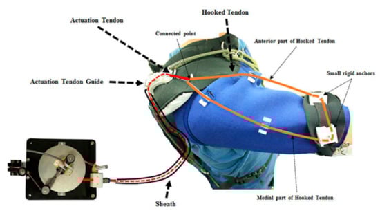 Park et al. [] developed a soft device that reduces muscle fatigue of the shoulder. This device supports the gravitational force of the shoulder for any posture of the arm using an actuation tendon that constantly pulls the upper arm upwards. This device is helpful to reduce the muscular fatigue of the user, minimizing the possibility of injury. The components of the device are shown in Figure 2.