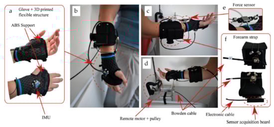 Cable-based soft exoskeleton for the wrist. (a) The glove together with the 3D printed flexible structure. (b–d) Bowden cables are driven by a remote motor and pulley. (e) A load cell was used to measure the force. (f) A strap wrapped around the forearm was employed to hold the Bowden cables and the sensor acquisition board [] (Open access).