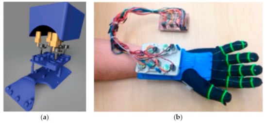 Rudd et al. [] designed a hand rehabilitation skeleton for remotely applied physiotherapy. It is built with widely available components and 3D printable parts. Its installation is visualized in Figure 6.