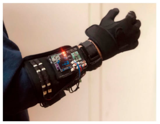 Chiaradia et al. [] developed a cable-based soft wrist exosuit. The device reduces muscle fatigue and allows it to lift small weights of up to 3 kg. Figure 5 shows the device and its components.