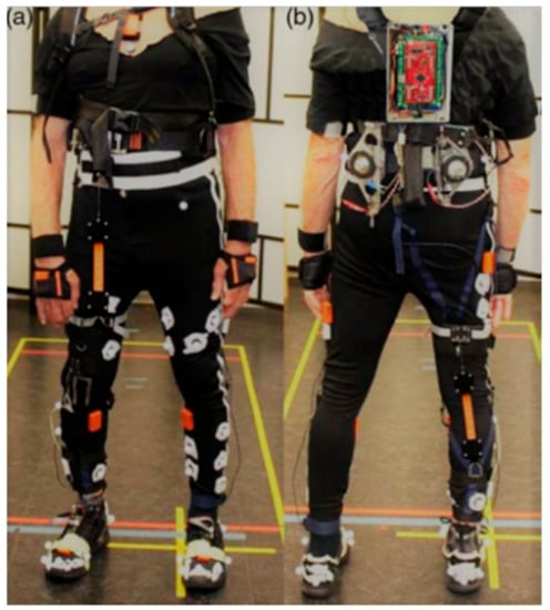 Portability: It is directly related to the weight of the device. The lower the weight of the exoskeleton, the greater the portability. Further, this benefits the patient by moving facilely without excessively fatigued. Furthermore, for portability, the device must be compact, easy to equip and remove, and maneuverable so that the user can move freely. Additionally, the system complexity should be reduced and only include the degrees of freedom that allow the desired mobility. The power supply and some actuators should be located away from the affected joint or separate from the body. Some systems are accompanied by walkers with automatic wheels, which carry heavier components, such as motors, controllers, electronic boards, and batteries []. Another significant point to achieve portability is to unite the device’s components in a garment that is easy to put on and take off, for example, an exoskeleton of the hand attached to a glove.