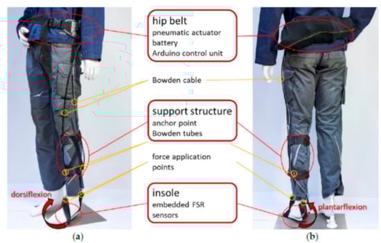 - Schubert, T.; Wollesen, B.; Weidner, R. Development and Preliminary Evaluation of a Lower Body Exosuit to Support Ankle Dorsiflexion. Appl. Sci. 2021, 11, 5007. [Google Scholar] [CrossRef]
