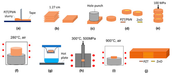 Several procedures have been established for tape casting ZnO [55]. In this case, however, the slurry was made with 15 g of ZnO (Acros Organics, Morris Plains, NJ, USA), 10 g Vehicle A, 8.4 g Vehicle B, and 10 g MEK to adjust the viscosity. For casting the slurry, the doctor blade height was adjusted to 7 mil (177.8 µm). After drying for 4 h, the ZnO tapes, 17–18 μm thick, were peeled off the Mylar film and cut into circular sheets with diameter 0.635 cm. Each ZnO sheet was then placed atop each PZT stack in a concentric manner, as shown in Figure 1d). The process is described in Figure 1. Samples containing 16 and 32 PZT elements were fabricated using this process.