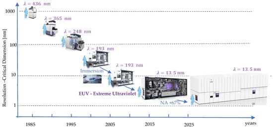 Evolution of photolithographic resolution over the last 4 decades (critical dimension, viz., the size of the smallest feature that can be printed on a microchip) and the sizes of ASML machines. Each evolutionary step is achieved by reducing the light source wavelength, λ; increasing the numerical aperture, NA, of the optical column; or both.