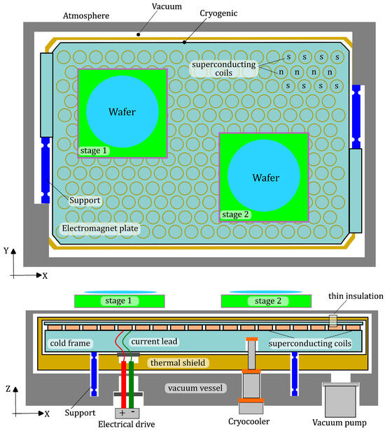 Schematic representation of the superconducting dual-stage planar motor for lithography application with various components, viz., two magnetically levitated movers (green) at room temperature carrying the wafer (blue), cold frame (light blue) with superconducting coils (orange), active thermal shield (yellow), vacuum vessel (gray), and struts for kinematic mounting (dark blue) [].