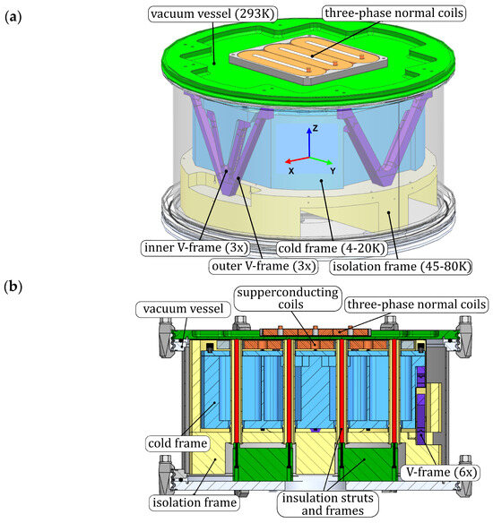 Demonstrator of a superconducting magnet plate for potential application in an in vacuum planar motor: (a) isometric view—the three-phase normal coils are magnetically levitated on top of the vessel; (b) cross-sectional view—the superconducting coils are mechanically fixed to the cold frame (blue) and thermally isolated, via an isolation frame (yellow), from the environment.