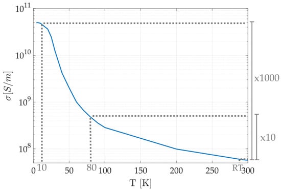 Electrical conductivity of copper as a function of temperature (adapted from []), which shows a significant increase below 80 K.