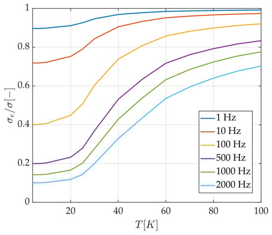 Figure 5 shows the ratio of the effective conductivity of a unit cube of copper OFHC to the conductivity calculated according to Equation (1) as a function of temperature for various working frequencies. The figure shows that the impact of the penetration depth (or skin depth) on the conductor conductivity increases for increasing frequency.