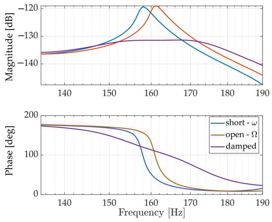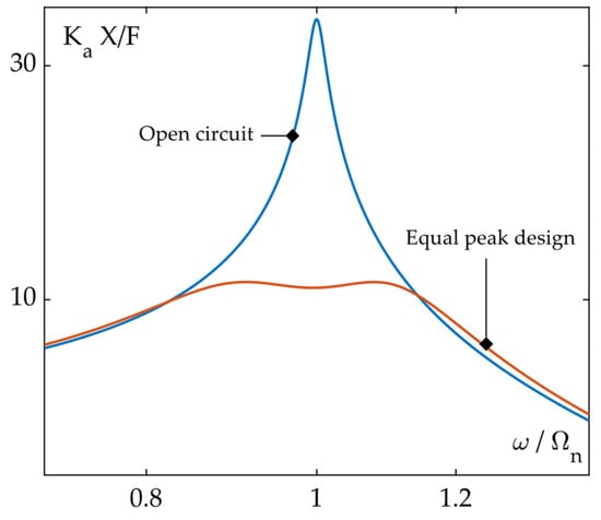 The piezoelectric transducer, shunted on the inductor, L, and the resistor, R, behaves in a very similar way as the mechanical tuned mass damper system. The piezoelectric capacitor and the circuit inductor constitute the resonant system, which is tuned to maximize the circuit absorption, while the resistor is used to dissipate the absorbed energy, either mounted in series or in parallel [,]. Typically, the RL circuit is tuned to minimize the norm (i.e., the maximum) of the frequency response function (FRF) from the external force, F, to the displacement, x, of the mass. This design is usually referred to as the equal peak design, as it results in two peaks with equal amplitude, as shown in Figure 7.