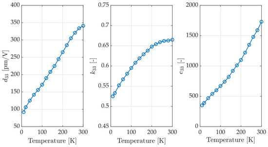 Finaly, one should note that the coupling factor, is a material property, which scales with three temperature-dependent piezoelectric properties, as follows: (i) the piezoelectric constant, in [m/V]; (ii) the dielectric constant, [-]; and (iii) the elastic compliance, [m2/N], as follows []: