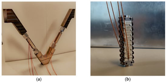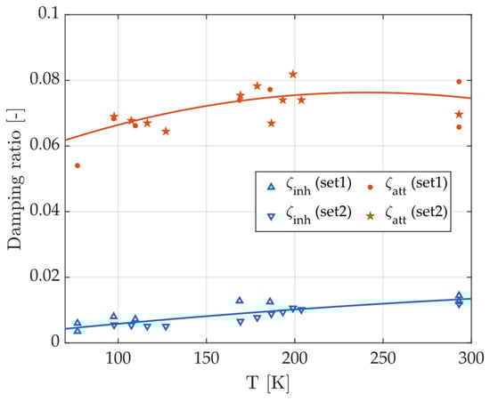 Compared to room temperature, the electromechanical coupling factor, , appears to decrease by 13% at 80 K and 22% at 4 K (as depicted in Figure 8 and Table 2). The effect on the damping performance is expected to be on the same order of magnitude, following Equations (10)–(12). On the other hand, the fraction of the modal strain energy addressed by the transducer depends on the relative compliance of the piezoelectric transducer with respect to that of the structure, and, thus, can be optimized by design to be maximal at low temperatures. For our specific application, the reduction in the elastic compliance from 293 K to 80 K of the titanium Ti6Al4V V-frames was 10% [], while the reduction in the elastic compliance of the PZT-5A transducer was about 20%, according to Table 2. The larger change in the compliance of the transducers results in only a small change in the modal density of the strain energy, , and, thus, has little effect on the damping performance.