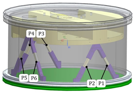 For first proof of concept of the superconducting motor, a demonstrator was developed. The design [] is depicted in Figure 3, where a set of three-phase normal conducting (moving) coils is magnetically levitated above the cryostat vessel. The superconducting part consists of three masses interconnected via flexure-based V-frames (struts) to provide kinematic support. The cold frame (in blue) keeps the superconducting coils at 4–20 K. The cold frame is connected via three pairs of double-hinged struts (inner V-frames) to the isolation frame (in yellow), which acts as a thermal shield, and is cooled down to 45–80 K. The isolation mass is connected via outer V-frames to the vacuum vessel (in gray), which operates at room temperature.