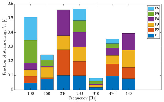 Fraction of the strain energy per mode, obtained using FEM simulations as a qualitative measure of the piezoelectric transducer’s efficiency in dampening a particular vibration mode. The colors are associated with each piezo stack.