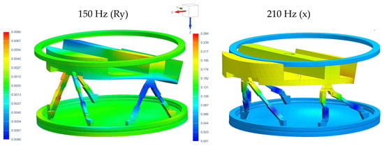 Nodal displacement of the modes at 150 Hz (Ry rocking mode) and 210 Hz (X translation mode) from FEM simulation.