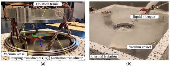 Test setup for measuring cryogenic damping: (a) piezoelectric transducers implemented as part of the V-frames that support the isolation frame connected to the vacuum vessel (only partly visible). Here, the cold frame is removed. (b) Isolated test setup, including full vacuum vessel, filled with liquid nitrogen for cooling to cryogenic temperatures.